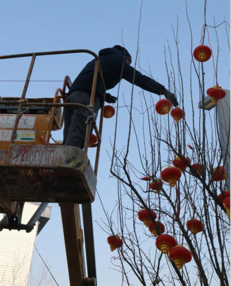 為給園區(qū)營造濃厚的節(jié)日氣氛,給入駐企業(yè)帶來如家般的溫情呵護,沈陽航發(fā)展運營管理有限公司物業(yè)團隊,在零下二十度的氣溫下,凍紅了雙手,冰覆了睫毛,但他們依然堅守,扶梯的扶梯、攀爬的攀爬,將火紅的燈籠掛在園區(qū)主干道、企業(yè)門前。滿街的火紅,是他們對園區(qū)的熱愛,也是對工作的執(zhí)著,更是對崗位責任的滿滿執(zhí)念。園區(qū)的燈亮了,客戶們洋溢的笑臉,映襯著角落里一道道靚麗的風(fēng)景線,夜幕降臨下,五彩斑斕的彩色燈光給園區(qū)增添了不少喜慶的色彩,也深深的印在了師傅們熱切的心里。